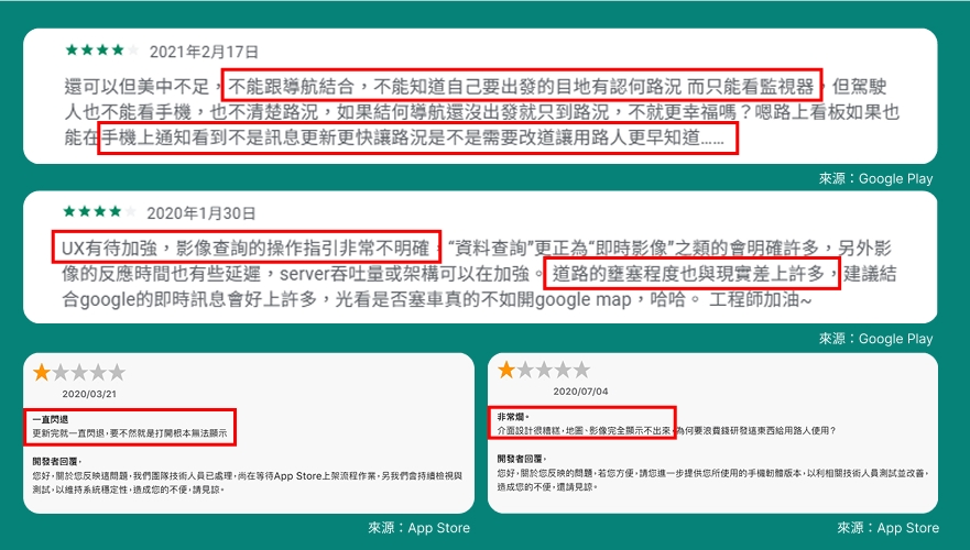 由於幸福公路 APP 的使用者相對分散,且我無法接觸到第一線駕駛族群,因此使用者研究的資料來源以 自身實際使用經驗 與 App Store / Google Play 的公開評論為主。經過整理與歸納後,列出下面主要幾個問題點:功能不足、即時性不佳,以及使用體驗不直覺等等。