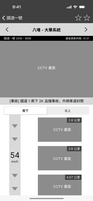 使用者可以依照國道、快速道路或快速篩選方式,迅速找到對應路段的攝影機與路況資訊。在介面設計上,參考了其他路況 App 的上下滑動檢視模式,並透過資訊簡化呈現,提升了瀏覽效率與可讀性。同時,使用者也能透過搜尋或單項選單快速定位,查看南下與北上的路況影像與時速數據。最後,在攝影機列表中清楚標示異常路況或事故訊息,幫助駕駛即時掌握路況,降低使用操作的時間成本。