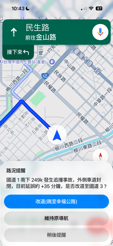 在前段影片中,我展示了從路線規劃到跳轉 Google Maps 開始導航的流程。接下來這三張圖片,則模擬了導航途中出現事故通知的互動情境:駕駛人可即時收到幸福公路的路況提醒,並快速選擇是否改道或維持原路,確保行駛決策更有效率與安全。